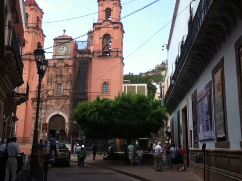 On Sundays midday the State band plays at the Kiosk. There are also various street musicians playing at the plaza side restaurants, including mariachis and norteños. On weekend and holiday evenings, roving musicians, the estudiantinas, pass through the Jardin on their way around Guanajuato’s colonial center.